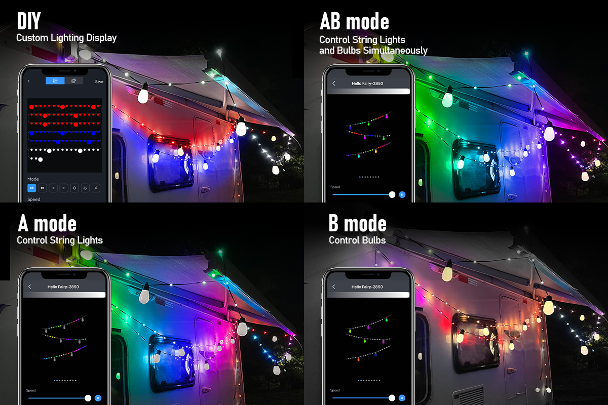 Customizable Patterns - Create a unique and personalized outdoor atmosphere with Aoycocr's custom lights display feature. Using the Hello Fairy app, you can customize each bulb and bead to display different colors, speed, and mode.