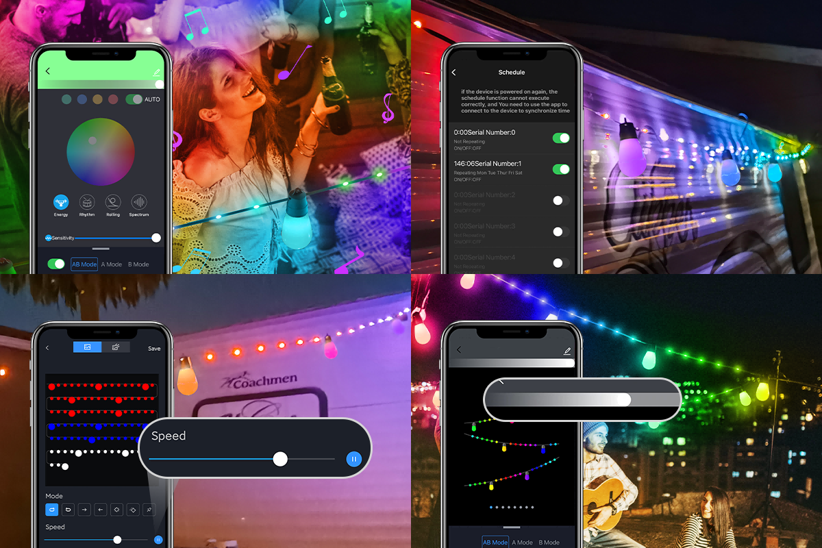 Music Sync - The integrated mic in the smart outdoor string lights allow it to react to your music, making it perfect for any party or romantic night out.