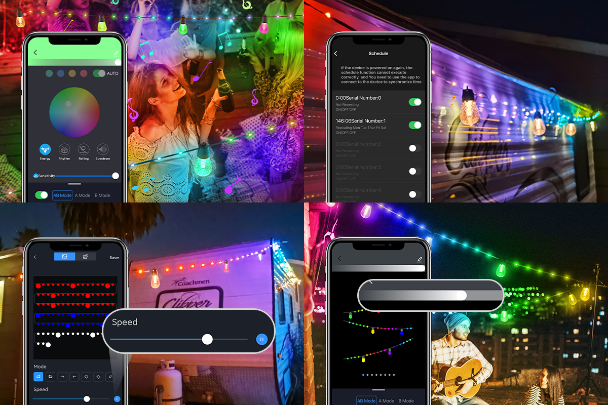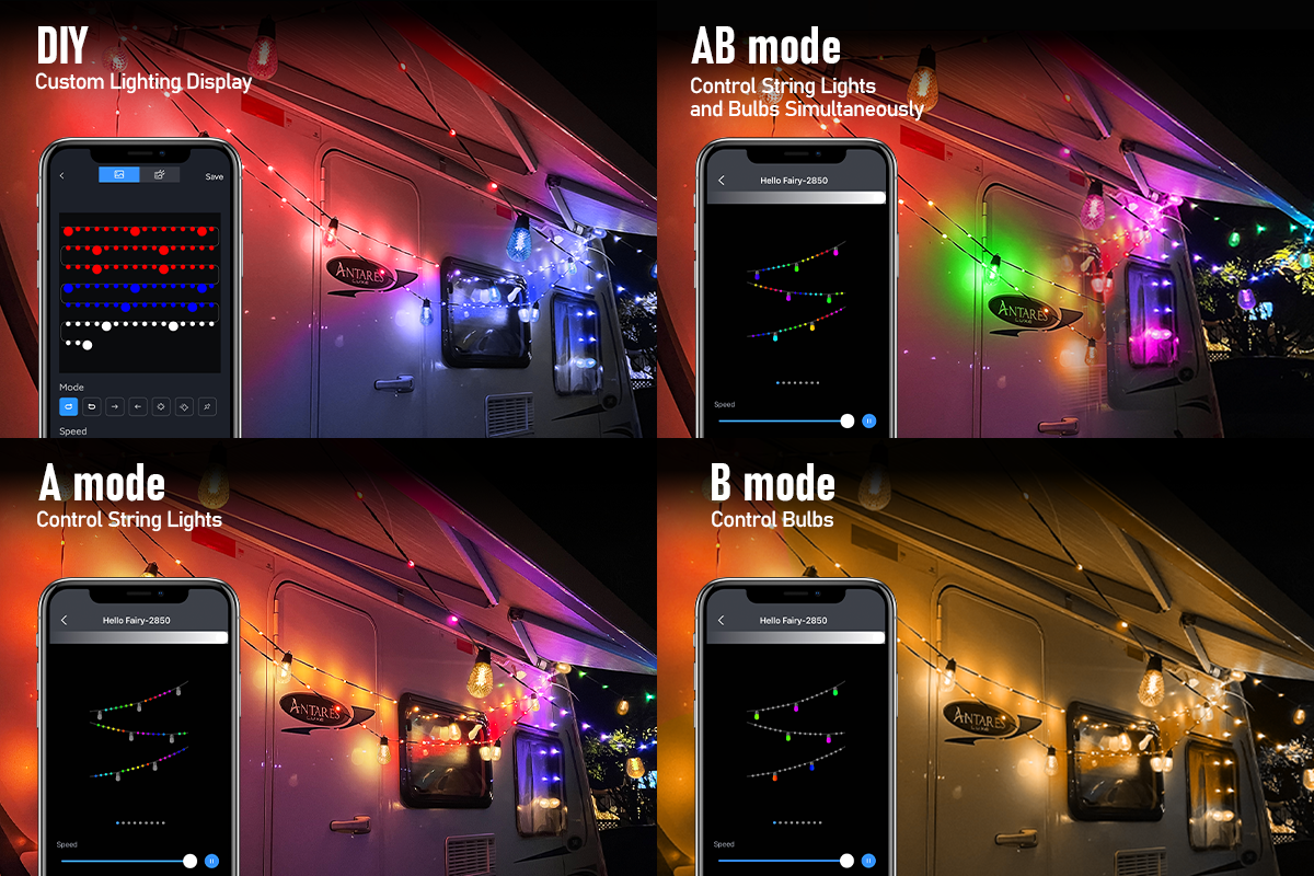 [INNOVATIVE CONTROL MODES] Aoycocr rgbw outdoor lights offer you 3 control modes to control mix or indenpendent control these string lights: AB mode for controlling the bulbs and bead simultaneously, A mode for controlling only beads and B mode for controlling only bulbs. For example, for Halloween, you can set up red&purple for both bulbs or beads – the options are plenty.