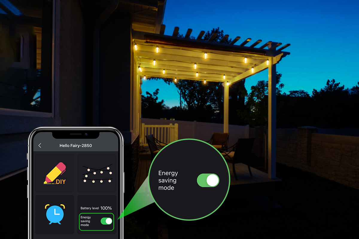 Smart App Control - Connect the outdoor lighting to the "Hello Fairy" App via Bluetooth. Set up 3 lighting modes in 5 different speeds, dim the lights smartly, set personal timers or countdowns for your bistro lights.